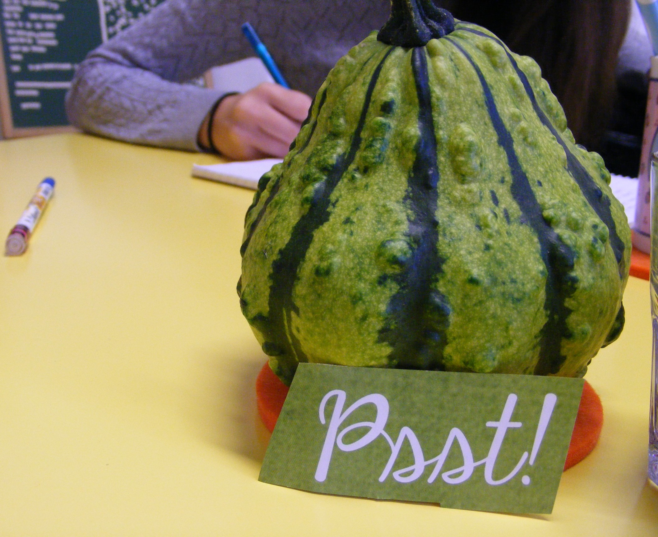 Ich bin Swantje und mache ein Praktikum bei Frau Winter. Heute soll ich einen Gastbeitrag schreiben. Außerdem gehe ich in einer ihrer Schreibkurse. Das letzte Mal in der Schreibwerkstatt schrieben wir über einen kleinen, grünen Kürbis, der mit Beulen übersät war. Lange betrachteten wir den Kürbis und fühlten die Struktur seiner Oberfläche. Und dieser Kürbis stellte ein wunderschönes Motiv für eine Herbst oder Halloweengeschichte dar. Halloween ist zwar schon vorbei, aber der Herbst noch lange nicht. Während wir schrieben suchte Frau Winter aus der Wortschatzkiste das Wort >Psst!< , raus welches wir dann sofort in die Geschichte einbauen sollten. Ich schrieb über Halloween, der Kürbis war die Nase einer gruseligen Strohpuppe, andere ließen den Kürbis sprechen. Ich wünsche euch viel Spaß beim Schreiben! Was fällt euch zu diesem Kürbis ein? Nun kommt meine Geschichte: